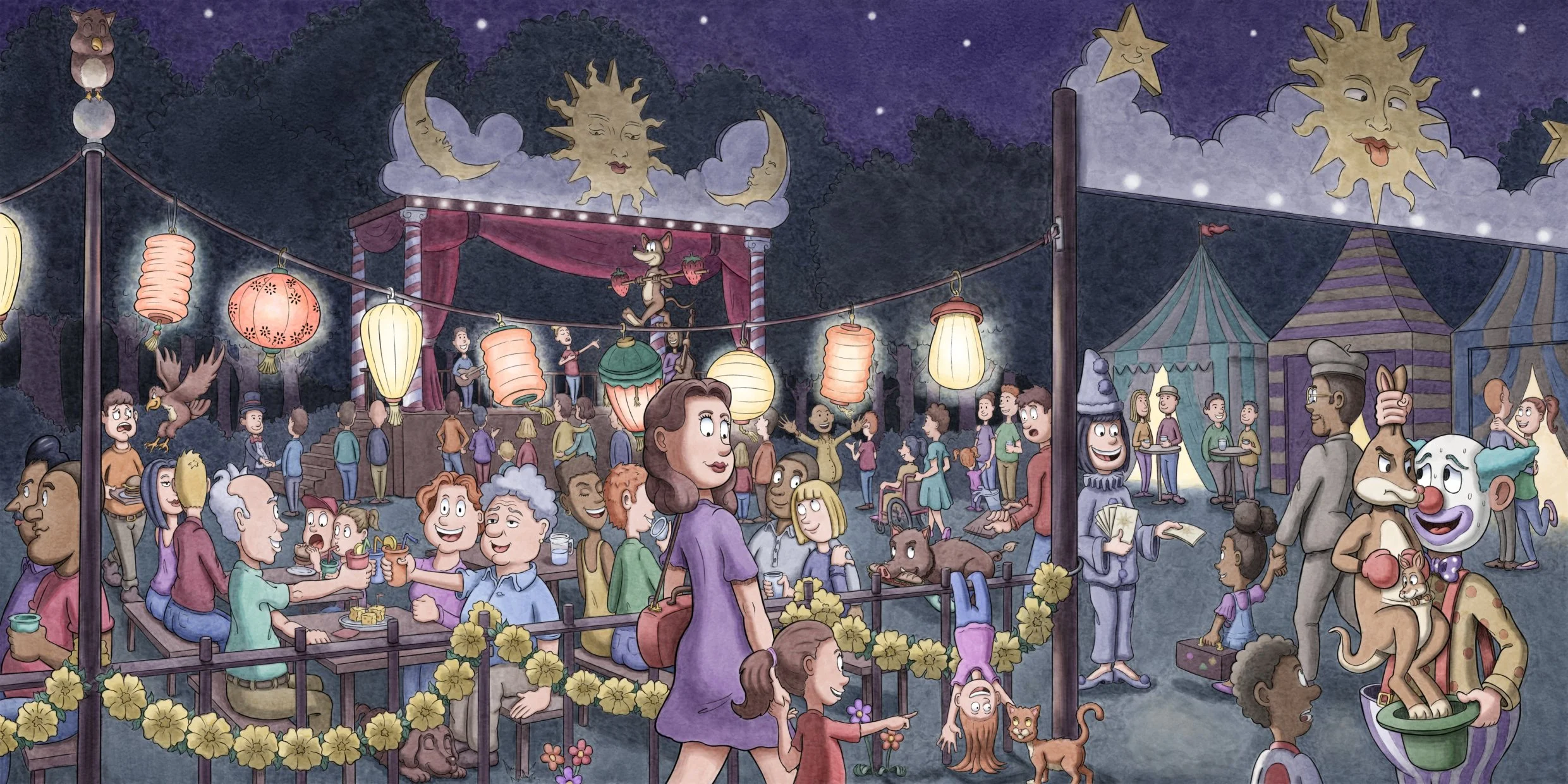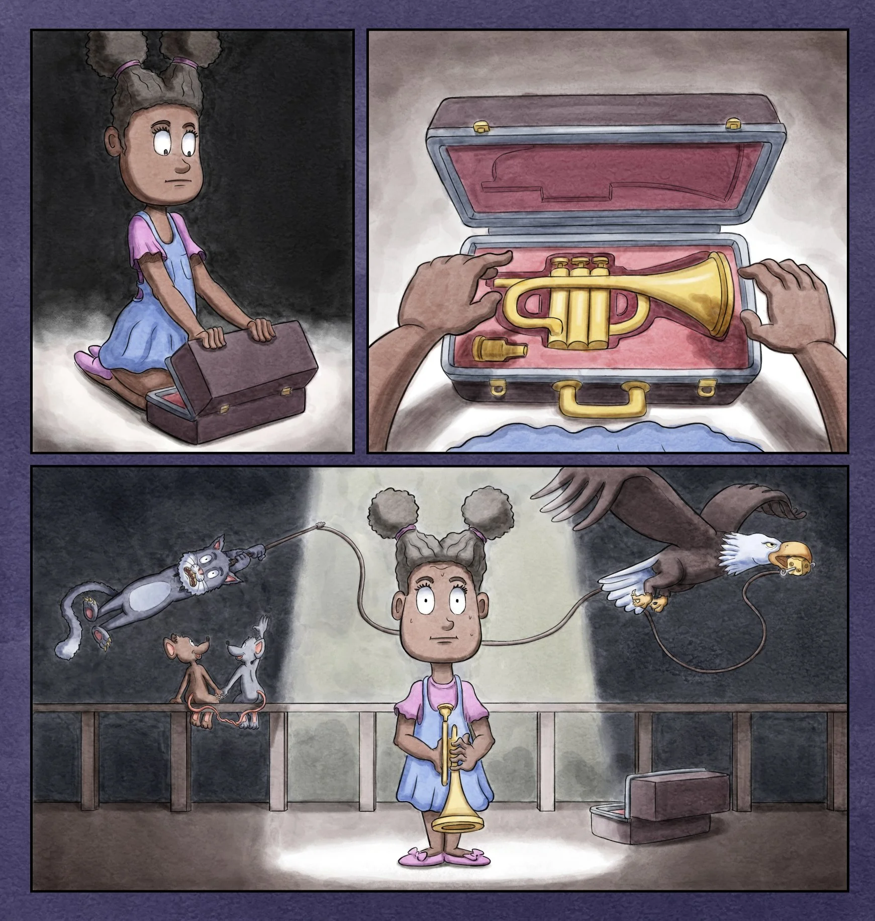 “Stage Fright” is a silent picture book about the anxieties of performing live in front of an audience. The story follows a little girl who is due to play for the first time in front of a large crowd. As she makes her way onto the stage, her initial excitement quickly turns to horror. Will the power of music help her overcome her fears?