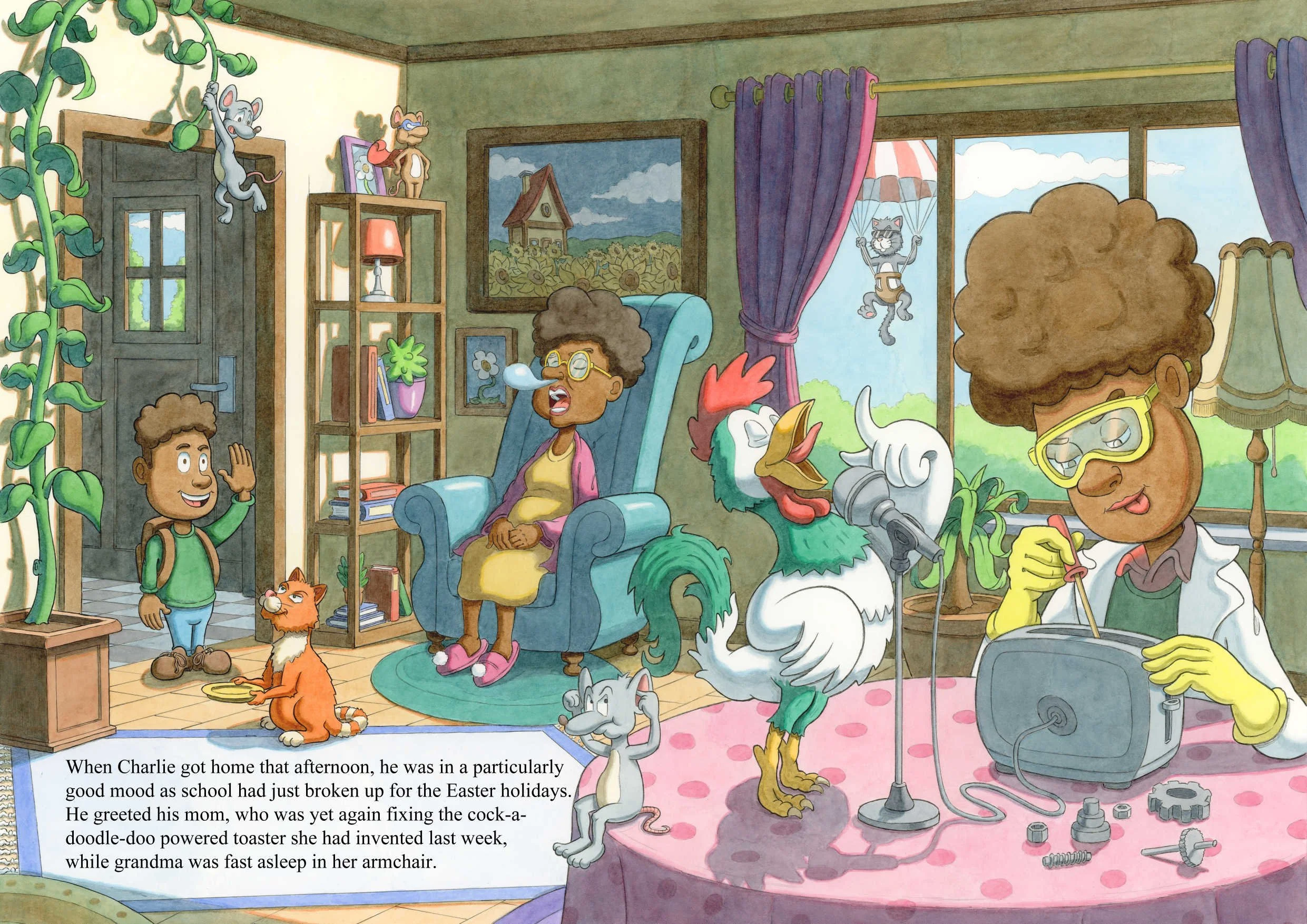 “Double Trouble Time Machine” is a picture book about a young boy named Charlie, who has to write an essay about a family member’s life. When he rejects the idea of writing about his “awfully boring” grandmother, his mother suggests for him to meet an ancestor from a distant past. With the help of Mom’s newly invented Time Machine, they bring back not one, but two of Charlie’s foremothers. But things do not go as planned. The two time travellers immediately take a disliking to one another and chaos ensues. Only Grandma’s irresistible cookies can save the day and Charlie finally sees her for the amazing person she has always been.